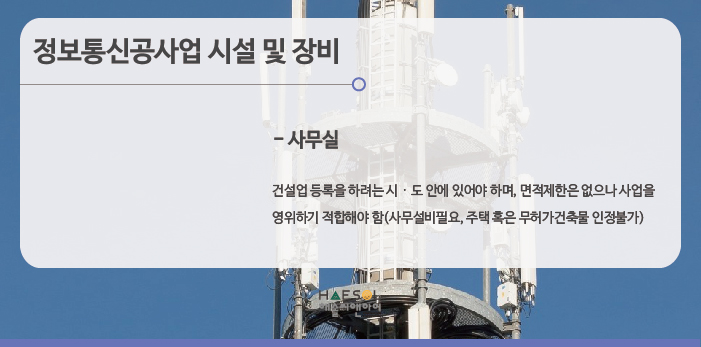 정보통신공사면허는 특수장비 기준이 없으며, 사무실만 구비되어있으면 됩니다.