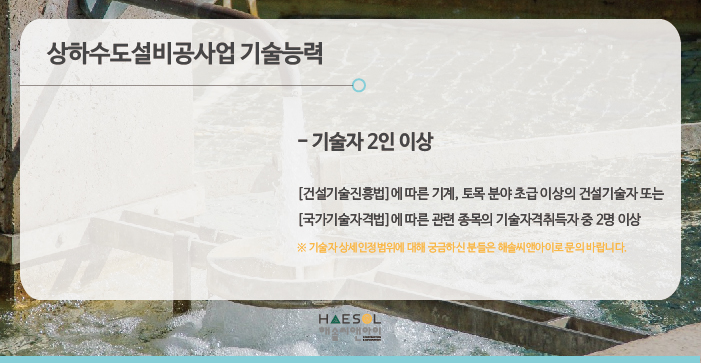 상하수도설비공사업은 총 2인 이상의 기술자격취득자가 준비되어야 합니다.