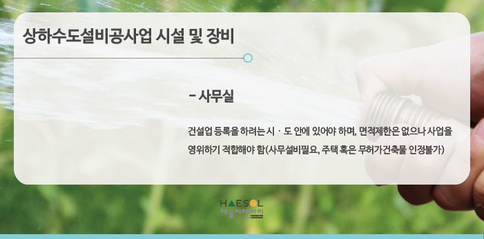 상하수도설비공사업의 경우 특수장비 기준이 없으며, 사무실만 준비되어있으면 됩니다.