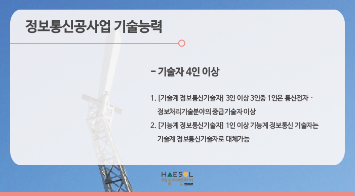 정보통신공사업의 경우에는 총 4인 이상의 기술자격취득자가 준비되어있어야 합니다.