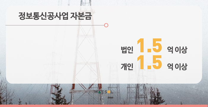 정보통신공사업은 법인과 개인사업자 모두 1.5억 이상의 자본금을 준비하셔야 합니다.