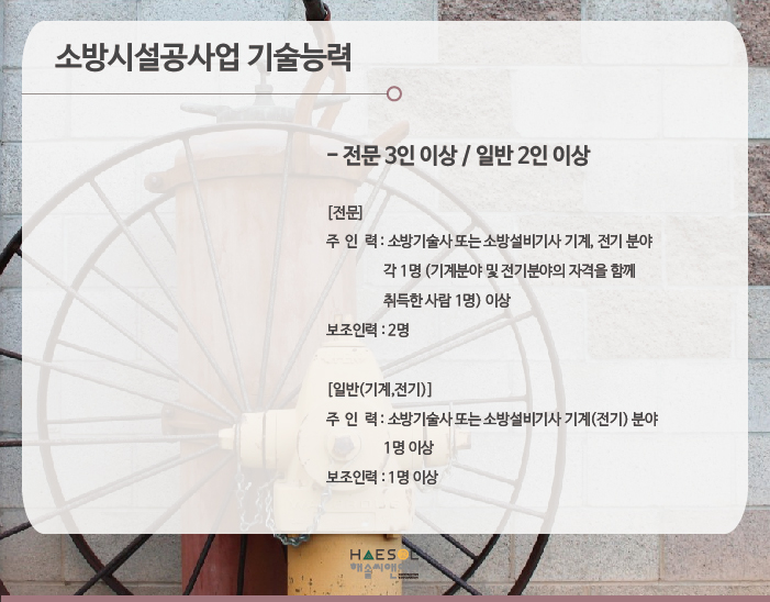 소방시설공사업 전문분야는 3인 일반(기계 혹은 전기)분야는 2인 이상의 기술자격취득자가 준비되어야 합니다.