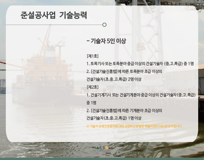 준설공사업은 총 5인 이상의 건설기술자를 준비하셔야만 합니다.