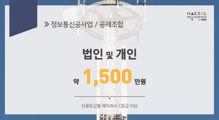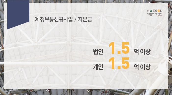 정보통신공사업은 법인이나 개인사업자 모두 1.5억 이상의 자본금이 준비되어 있어야 합니다.