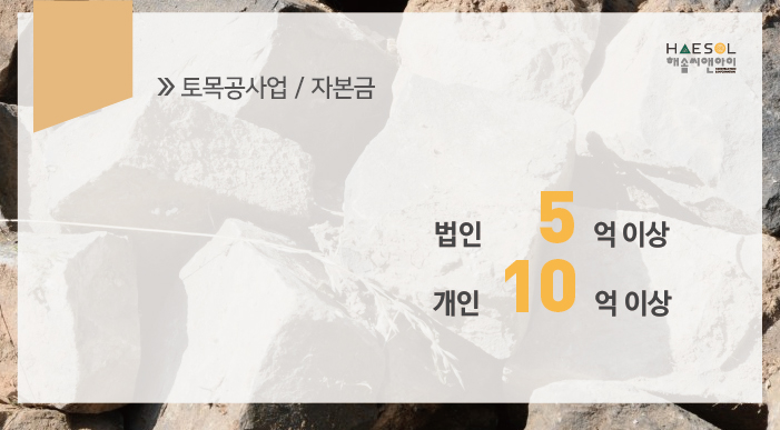 토목공사업 법인은 5억 개인은 10억 이상의 자본금이 준비되어 있어야 합니다.