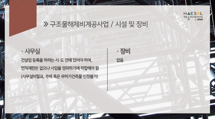 구조물해체비계공사업의 경우 특수장비 기준이 없으나 사무실은 꼭 준비되어야 합니다.