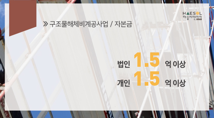 구조물해체비계공사업은 법인이나 개인사업자 모두 1.5억 이상의 자본금이 준비되어 있어야 합니다.
