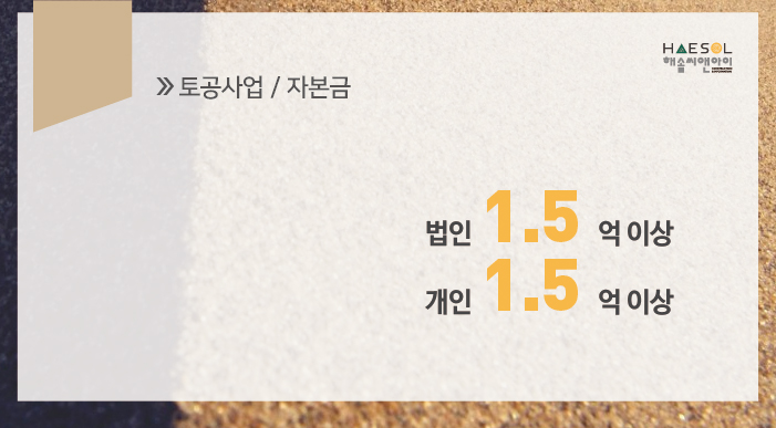 토공사업은 법인 및 개인사업자 모두 1억 5천만원 이상의 건설업 실질자본금이 준비되어야 합니다.