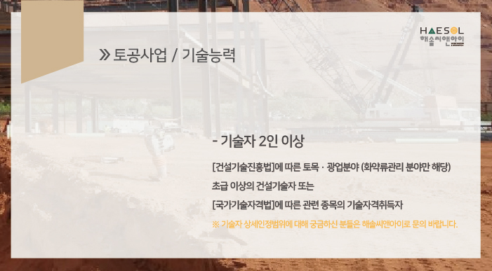 토공사업은 2인 이상의 기술자격취득자를 충원하셔야 합니다.