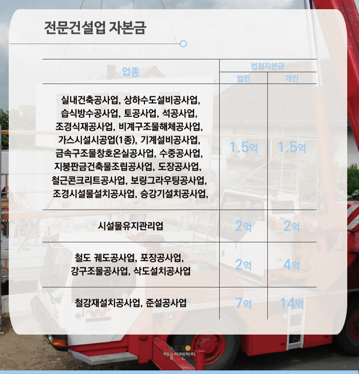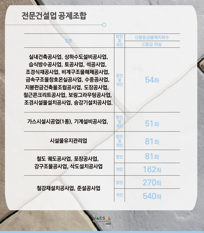 전문건설업면허는 업종별 법인, 개인사업자 모두 위 표에 해당하는 좌수만큼 전문건설공제조합에 예치하셔야 합니다.