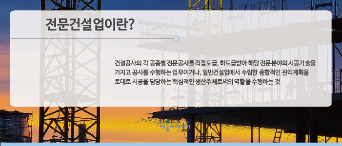 해당 전문분야의 시공기술을 가지고 공사를 수행하는 업를 전문건설업이라고 합니다.