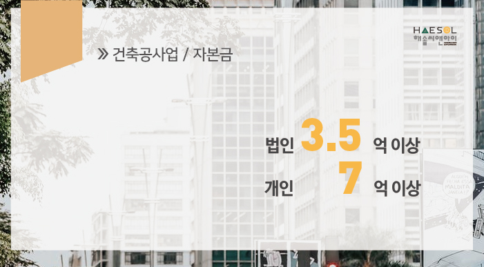 건축공사업 법인은 3.5억 개인은 7억 이상의 자본금이 준비되어 있어야 합니다.