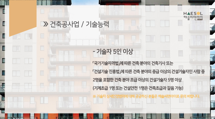 건축공사업은 총 5인 이상의 기술자격취득자를 준비하셔야만 합니다.