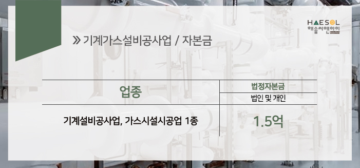 기계가스설비공사업은 법인과 개인사업자 모두 1.5억 이상의 자본금이 준비되어 있어야 합니다.