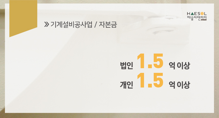 기계설비공사업은 법인이나 개인사업자 모두 1.5억 이상의 자본금이 준비되어 있어야 합니다.