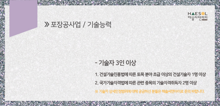 포장공사와 관련성이 있는 국가기술자격증 소지자 2인 이상 총 3인 이상을 준비해주시면 됩니다