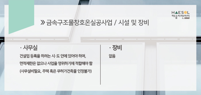 금속구조물창호온실공사업은 특수장비 기준은 없으나 사무실이 기본적으로 준비되어야 합니다.