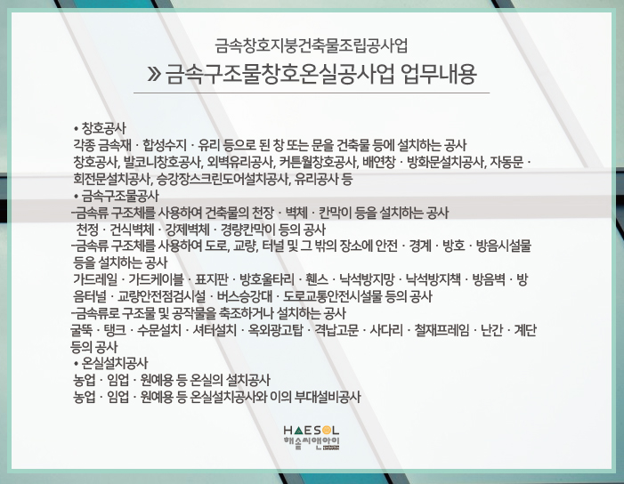 금속구조물창호온실공사업은 표에 명시되어 있는 것 처럼 창호, 금속구조물, 온실설치등의 공사를 진행하는데 있어서