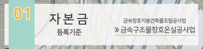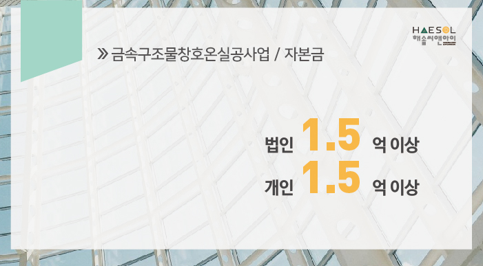 금속구조물창호온실공사업은 법인이나 개인사업자 모두 1.5억 이상의 자본금이 준비되어야 합니다.