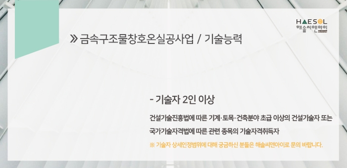 금속구좀룰창호온실공사업은 총 2인 이상의 기술자격취득자가 준비되어 있어야 합니다.