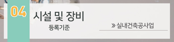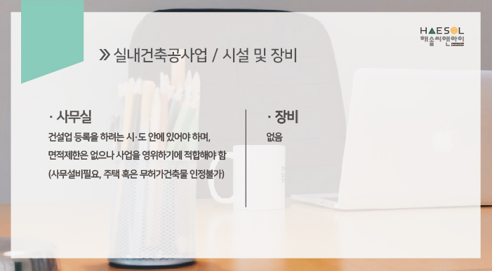 실내건축공사업은 특수장비 기준은 없으나 사무실이 준비되어야 합니다.