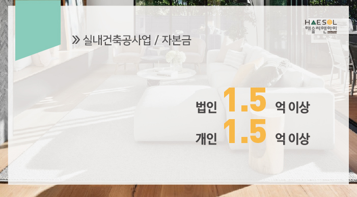 실내건축공사업은 법인과 개인사업자 모두 1.5억 이상의 자본금이 준비되어 있어야 합니다.