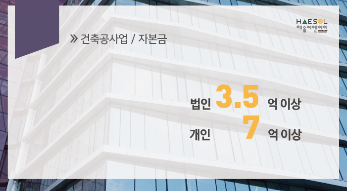 건축공사업 면허 취득을 위해서 법인 3억 5천만원 이상, 개인사업자 7억 이상의 자본금이 필요합니다.