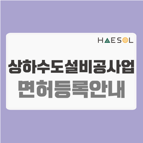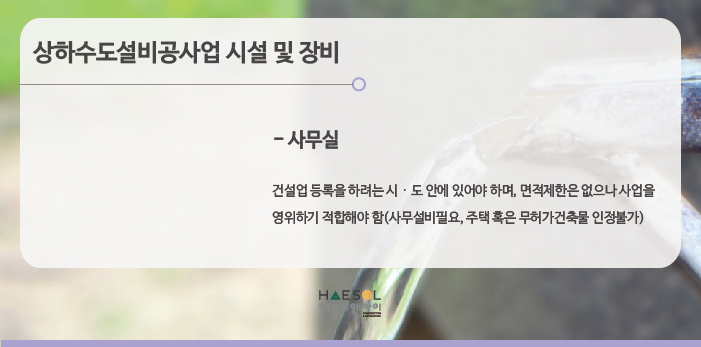 건설산업기본법에 의거하여 상하수도설비공사업 면허를 등록한 사업장만 사업을 영위하실 수 있습니다.