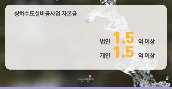 상하수도설비공사업은 법인이나 개인사업자 모두 1.5억 이상의 자본금이 준비되어야만 합니다.