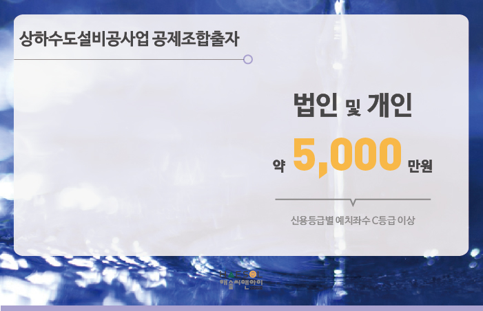상하수도설비공사업은 법인이나 개인사업자 모두 약 5,000만원의 출자금을 전문건설공제조합에 예치하셔야 합니다.