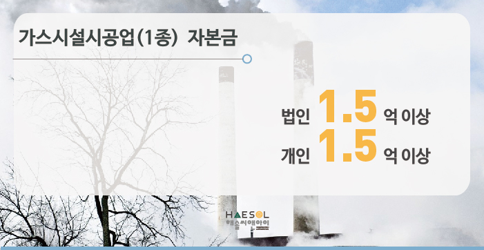 가스시설시공업은 1종만 법인이나 개인사업자 모두 1.5억 이상의 자본금을 준비하셔야 합니다.