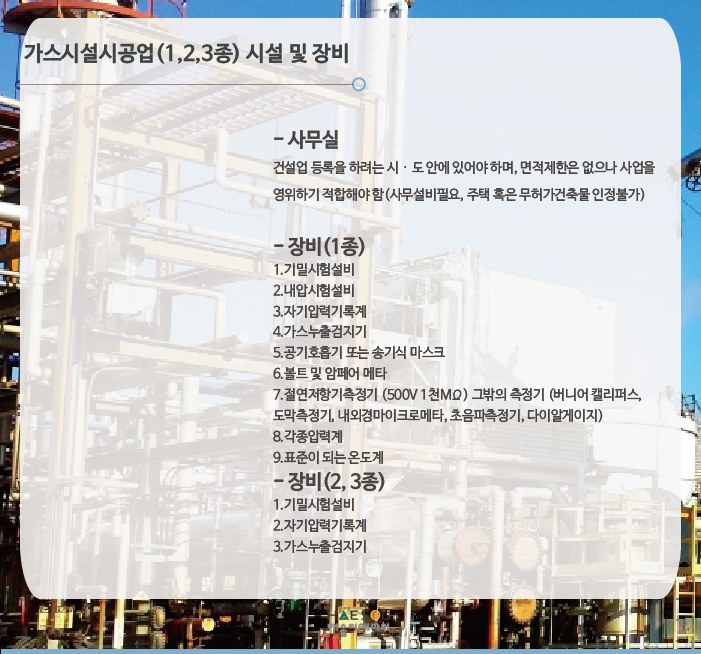 가스시설시공업은 1종은 9종 2, 3종은 3종의 장비가 준비되어야 합니다.