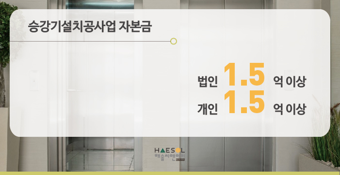 승강기설치공사업은 법인과 개인사업자 모두 1.5억 이상의 자본금을 준비하셔야 합니다.