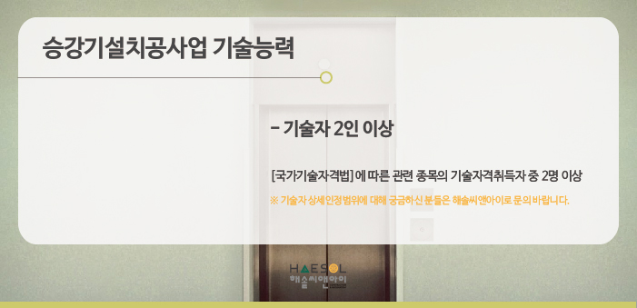 승강기설치공사업은 총 2인 이상의 기술자격취득자를 준비하셔야 합니다.