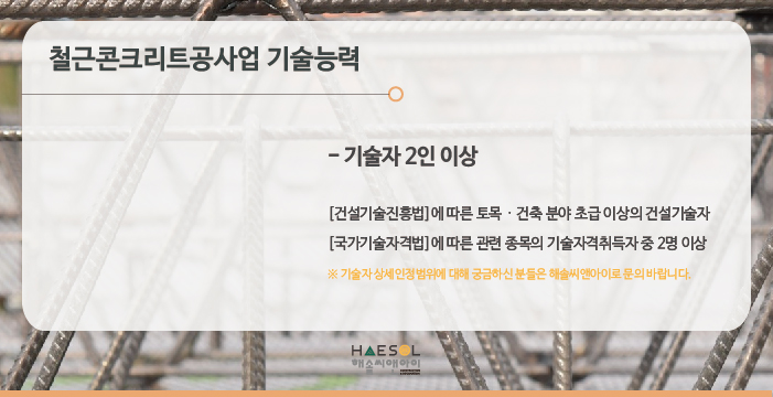 철근콘크리트공사업은 총 2인 이상의 기술자격취득자를 준비하셔야만 합니다.