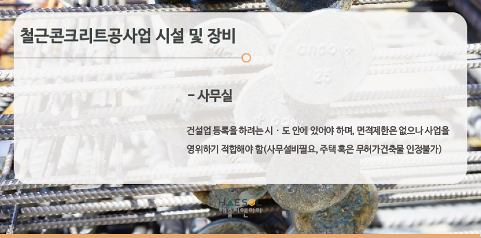 철근콘크리트공사업은 특수장비 기준이 없으며, 사무실만 준비하시면 됩니다.