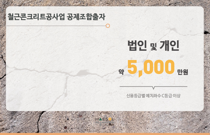 철근콘크리트공사업 약 5,000만원의 출자금을 전문건설공제조합에 예치하셔야 합니다.