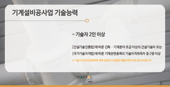 기계설비공사업은 총 2인 이상의 건설기술자격취득자를 준비하셔야 합니다.