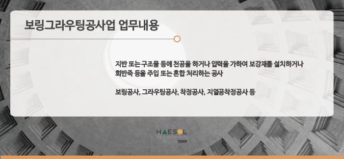 보링그라우팅공사업은 위 표에 나온 것 처럼 지반 또는 구조물 등에 천공을 하거나 압력을 가하여
