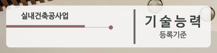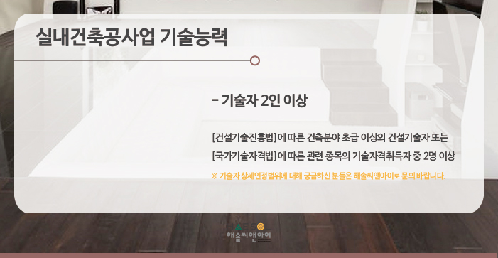 실내건축면허의 경우 총 2인 이상의 기술자격취득자를 준비하셔야만 합니다.