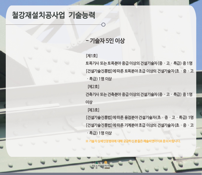 철강재설치공사업은 총 5인 이상의 기술자격취득자를 준비하셔야만 합니다.
