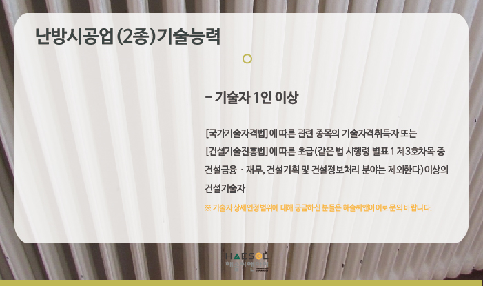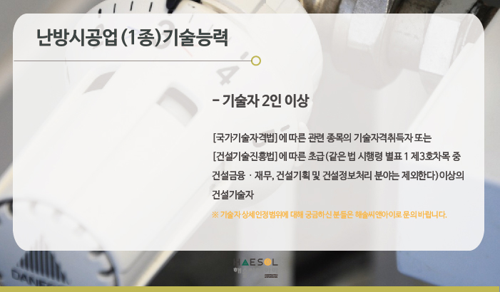 난방시공업면허의 1종은 2인 2, 3종은 1인 이상의 기술자격취득자를 준비하셔야만 합니다.