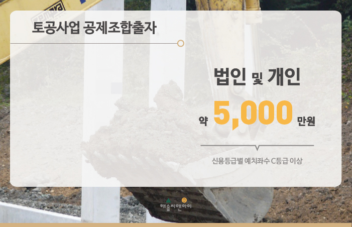 토공사업은 법인이나 개인사업자 모두 약 5,000만원의 출자금을 전문건설공제조합에 예치하셔야 합니다.